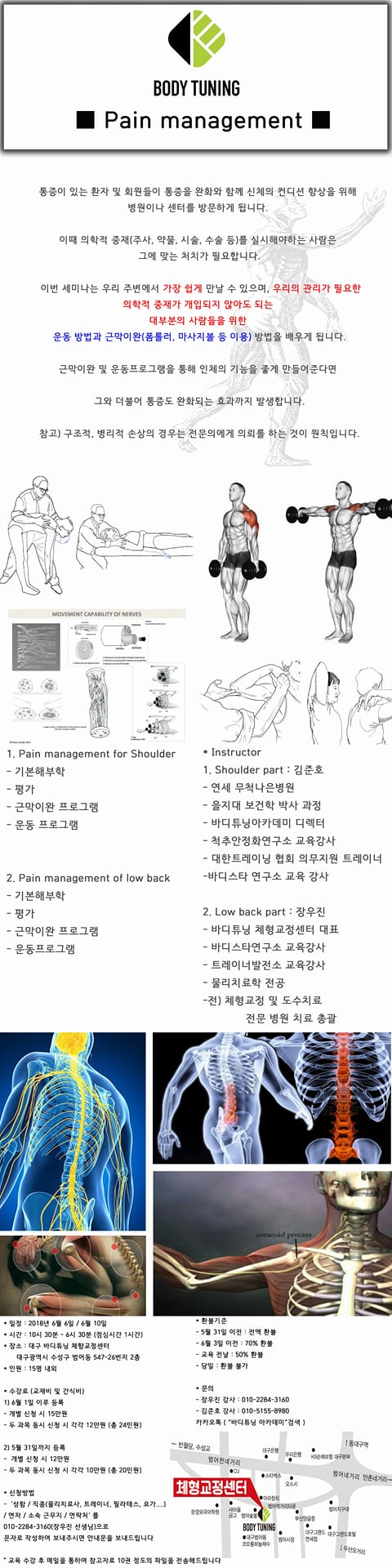 이번 세미나는 의학적 중재가 개입되지 않아도 되는 사람들을 위한 운동 방법과 근막이완(폼롤러, 마사지볼 등 이용) 방법을 배우게 됩니다.