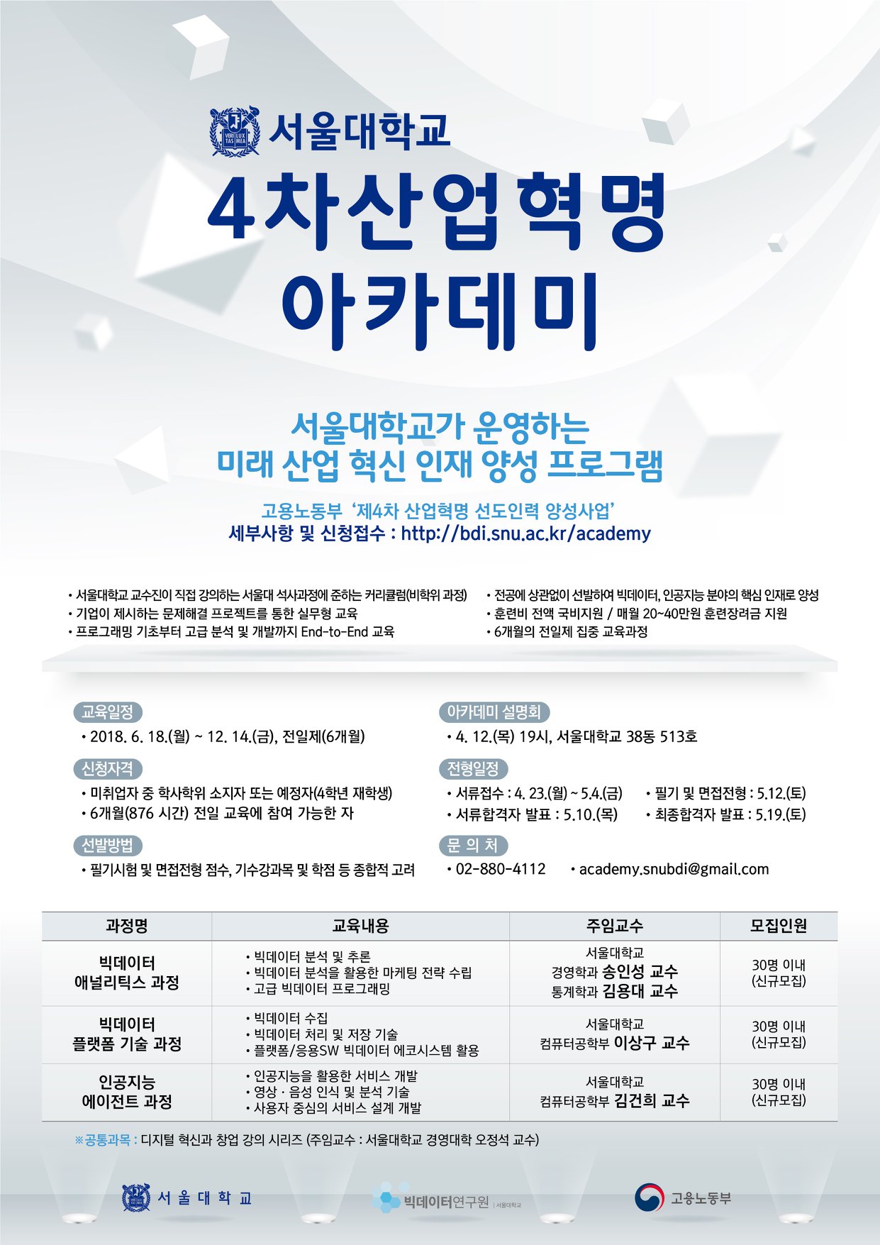[서울대 빅데이터연구원-고용노동부, ‘서울대학교 4차산업혁명 아카데미’ 2기 개설]