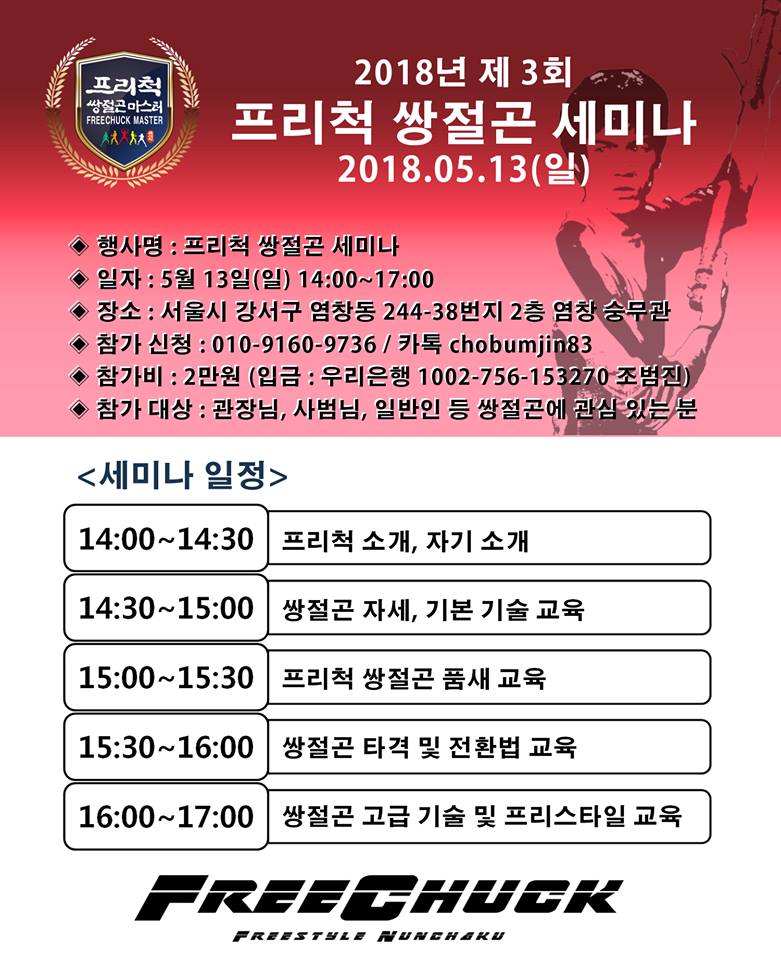 P.S. 이번 세미나에서는 세미나 수업 외에도 각종 봉, 검등 각종무기 기초법 단체 쌍절곤 연무를 시간이 괜찮으면 교육하겠습니다.