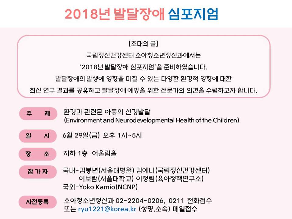 이번 심포지엄은 '환경과 관련된 아동의 신경발달'을 주제로 국내외 다양한 전문가를 모시고 발달장애 예방을 위한 의견을 듣는 시간이 될 것입니다.