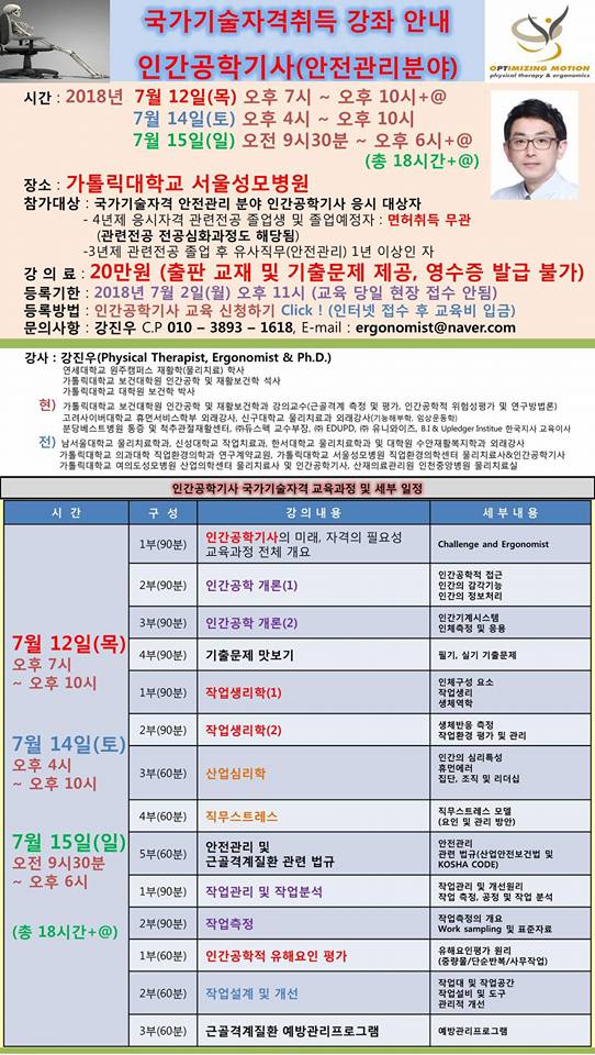 2018년도 정기 3회 국가기술자격 인간공학기사 취득을 위한 교육과정을 진행합니다(총 18시간+@).