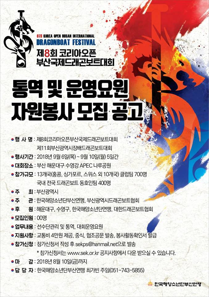 제8회 코리아오픈 부산국제드래곤보트대회 통역 및 운영요원 자원봉사 모집 안내