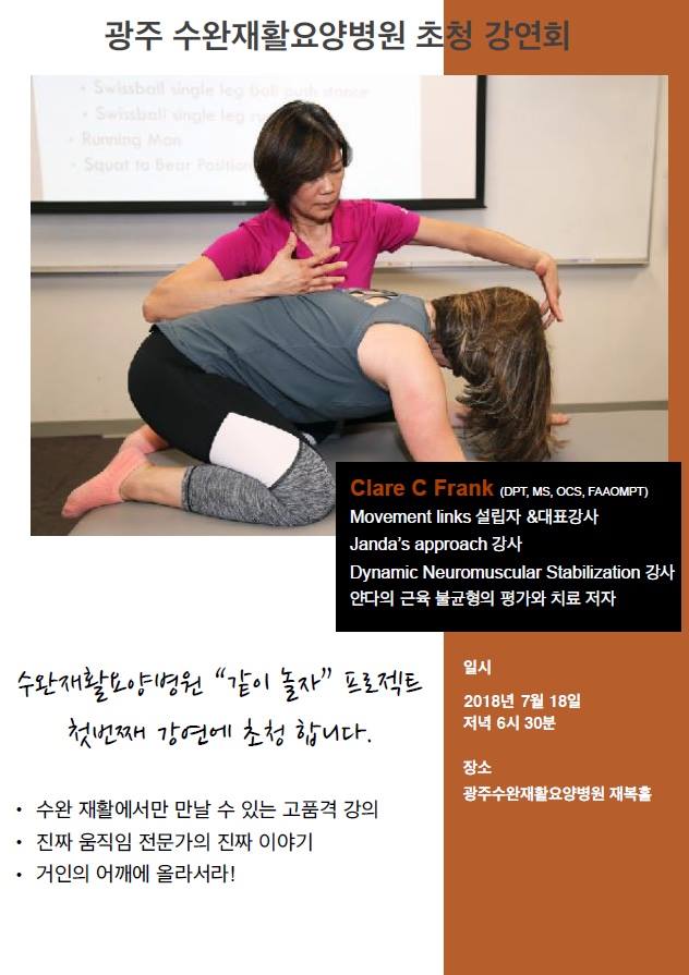 광주수완재활요양병원에서는 #Movementlinks 거장 Clare C. Frank 선생님을 모시고 움직임에 대해서 관심있는 선생님을 모시고 핫하게 놀아보고자 합니다.