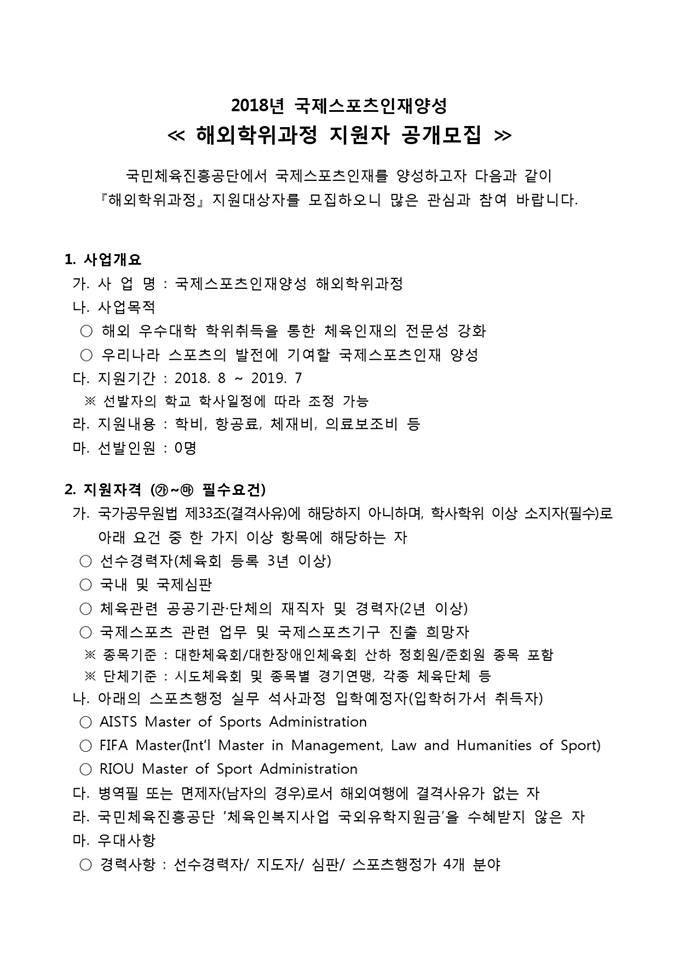 - 사업명: 국제스포츠인재양성 해외학위과정
