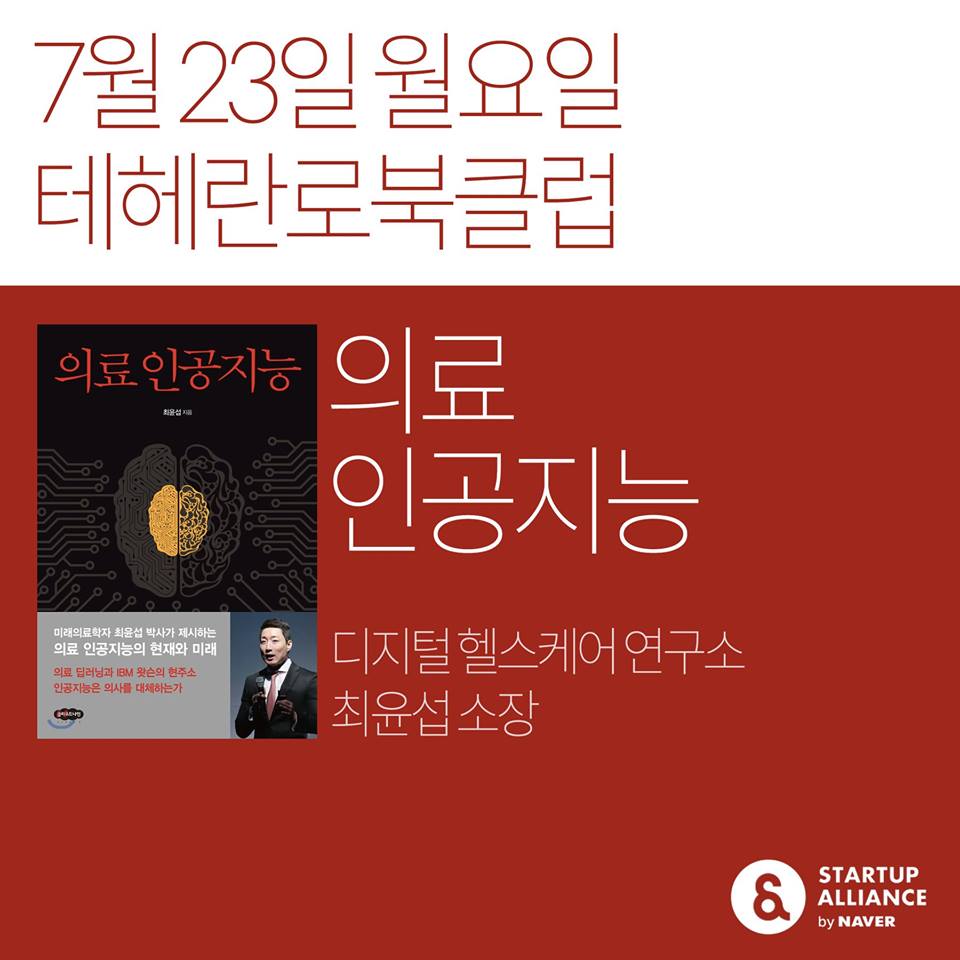 7월 23일 테헤란로 북클럽은 <의료 인공지능>에 대해 이야기 나눠보려 합니다. 실리콘밸리의 유명 벤처투자가인 비노드 코슬라는 "미래에는 80%의 의사가 첨단 기술로 대체될 것"이라고 발언해 의료계에 큰 파장을 일으켰죠. 실제로 인공지능은 현재 의료계에 활발하게 적용되고 있는 분야이며 암 환자 진단, 영상 의료 데이터 분석, 유전체 분석, 임상 시험 등에서 활용하려는 시도가 더욱 활발해지고 있습니다. 이렇게 '의료 인공지능 시대'를 맞이하고 있는 지금, 테헤란로 북클럽에서는 본 책을 집필한 최윤섭 저자를 모시고 '인공지능이 의료를 어떻게 혁신할 것인지' 알아보고자 합니다.