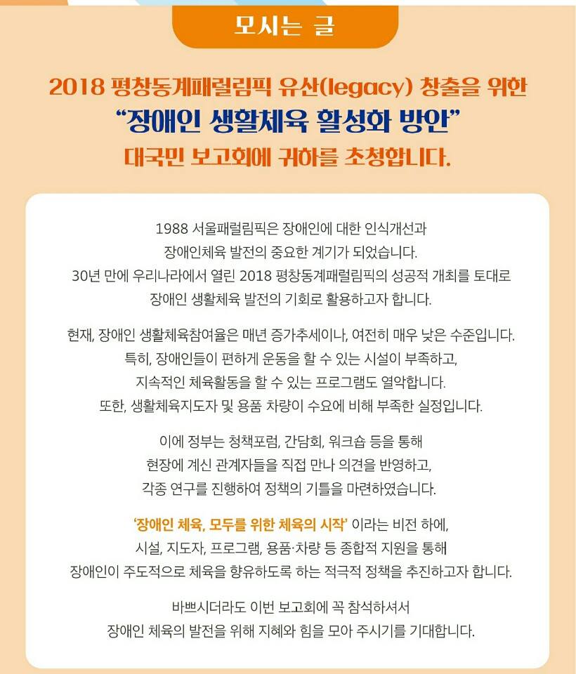 2018 평창동계 패럴림픽 유신(legacy) 창출을 위한 “장애인생활체육 활성화 방안” 대국민 보고회가 열려 집니다.