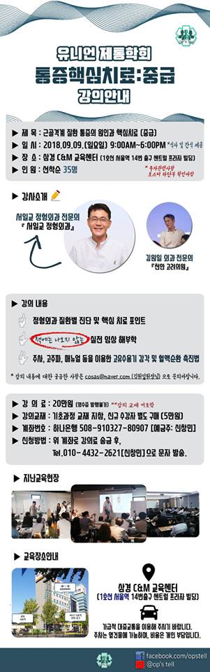 - 근골격계 통증 치료에 한계를 느끼는 의사선생님과 물리치료사에게 새로운 치료 접근을 배우실수 있습니다.