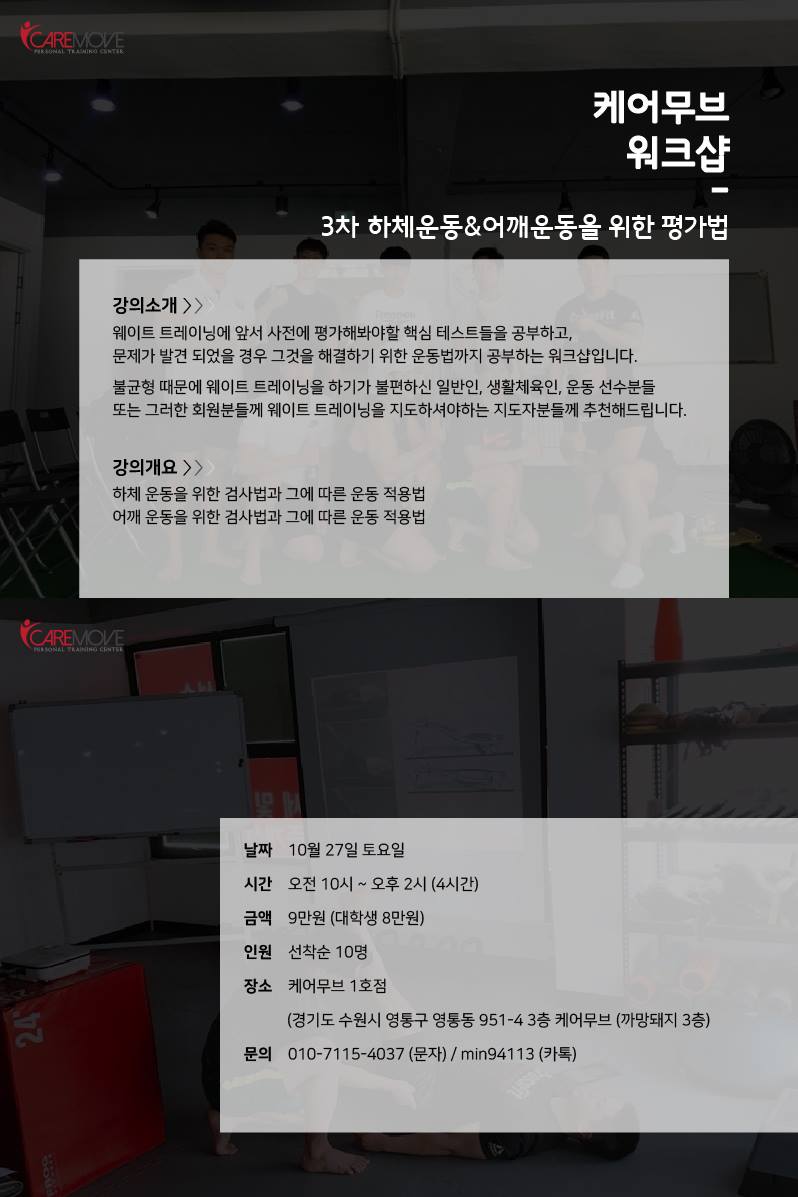 "3차 하체운동, 어깨운동을 위한 평가법" 워크샵이 진행됩니다.