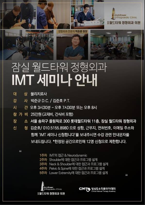 01051558980으로 성함, 근무지, 면허번호, 이메일 주소와 함께 'IMT 세미나 신청합니다'를 보내주시면 수강 관련 안내문자를 보내드립니다