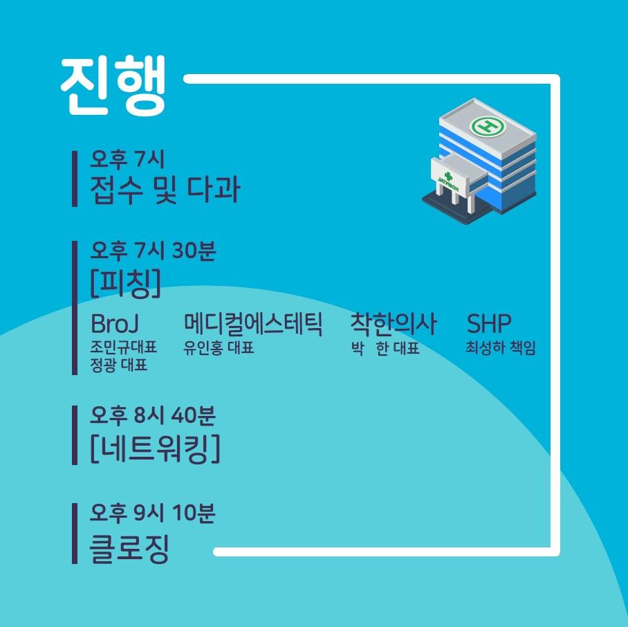 ★아래 기업들의 피칭 후 네트워킹 하기 전, "헬스케어 관련 스타트업"이며 "3분간 비즈니스 소개를 하고싶으신"분들은 문의 이메일로 회사명(서비스명), 서비스에 대한 간략한 소개를 보내주세요~★