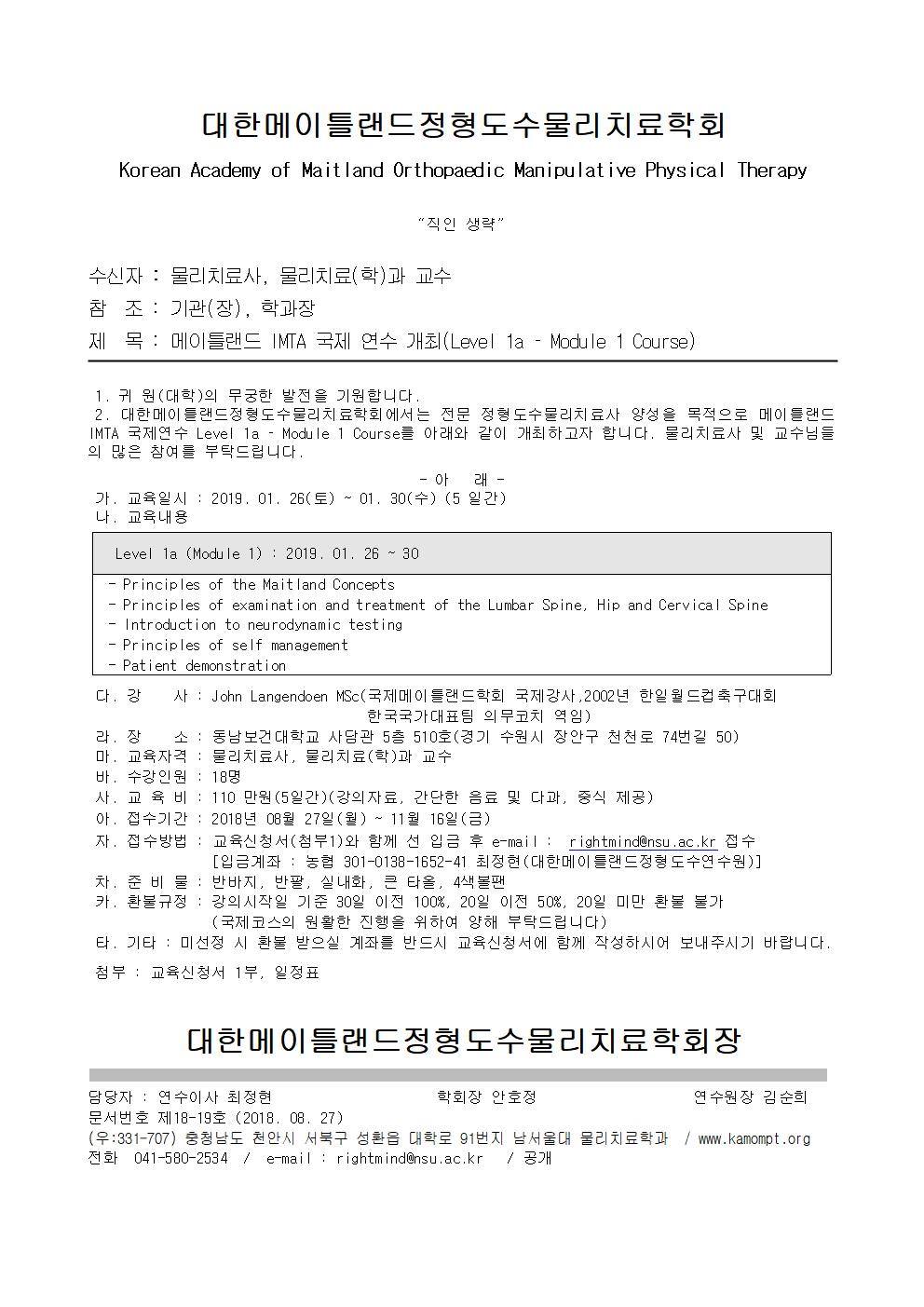 2019년 1월, IFOMPT (국제도수치료연맹)가 인정하는 메이틀랜드 국제코스가 열립니다.