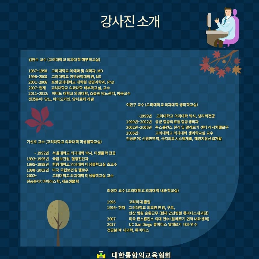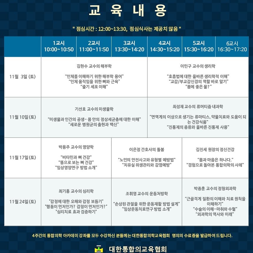 11월3일부터 4주간 매주 토요일 고대의대 강의실에서 진행됩니다