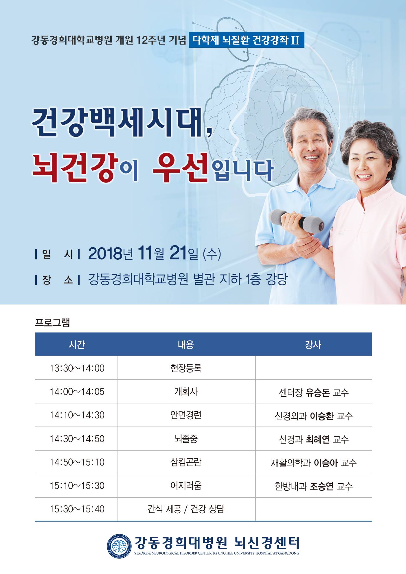 21일 수요일, 강동경희대병원에서 개원 12주년 기념 다학제 뇌질환 건강강좌를 개최합니다.